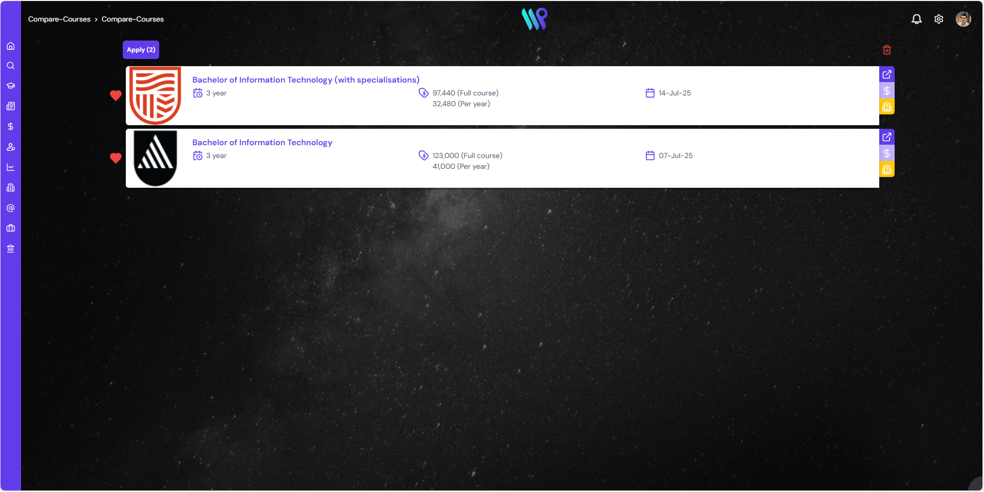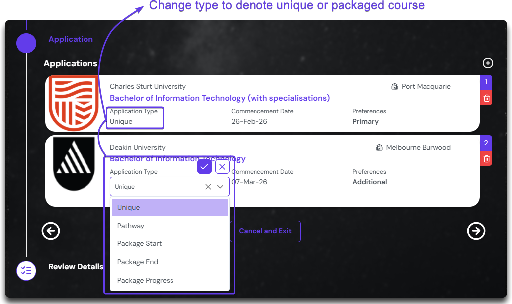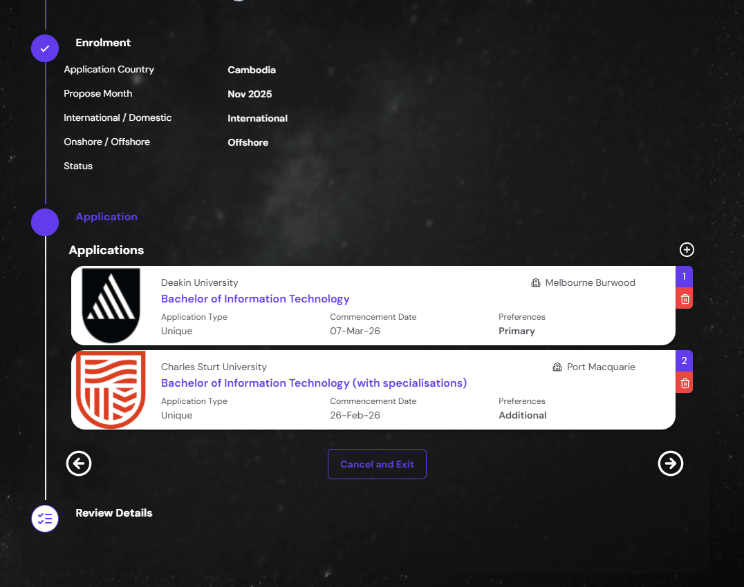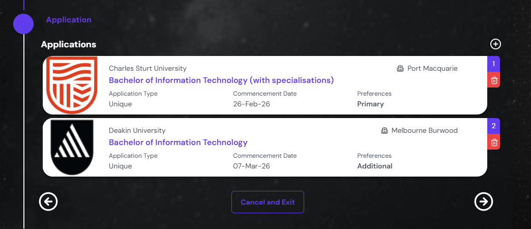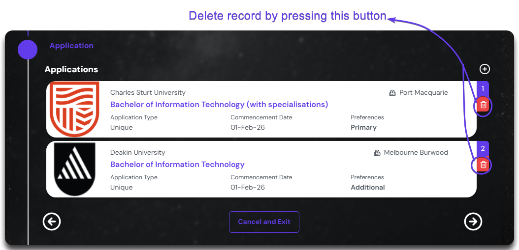 In case the application mentioned here is not the choice of the student, you can remove it by clicking on the delete button on the top right corner of each card.