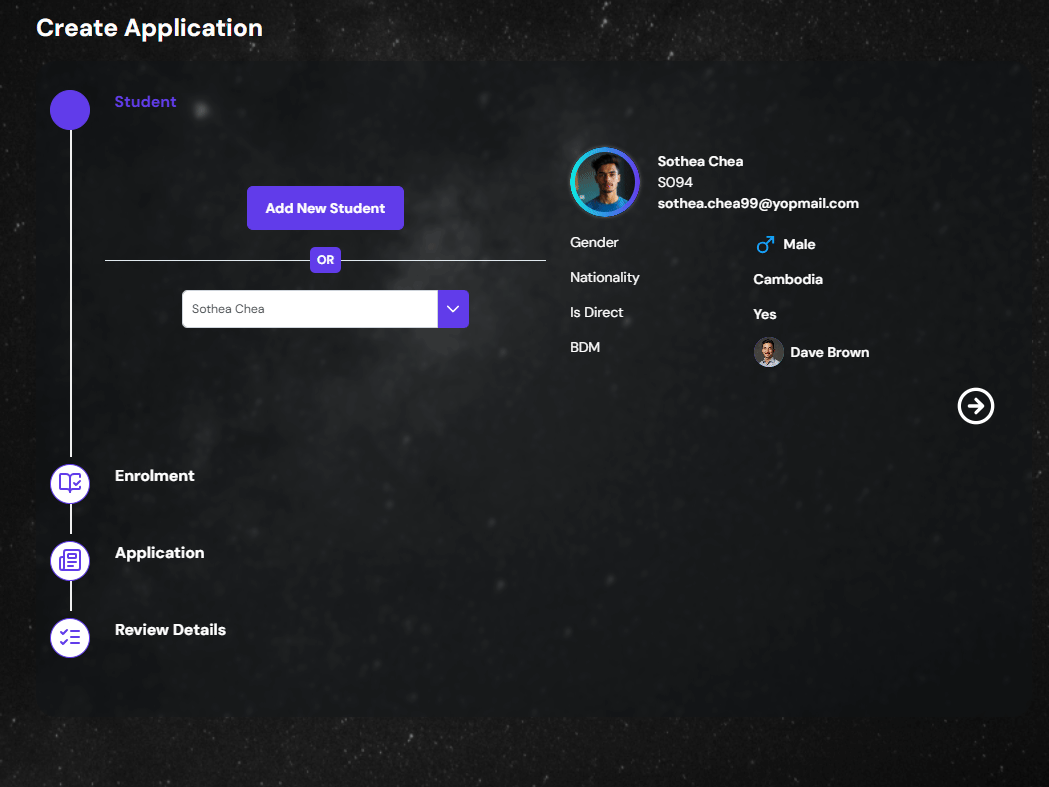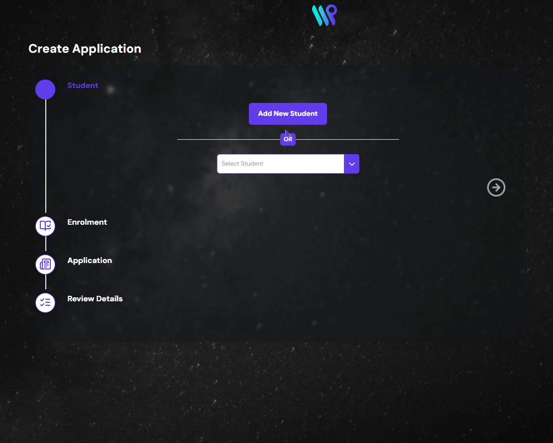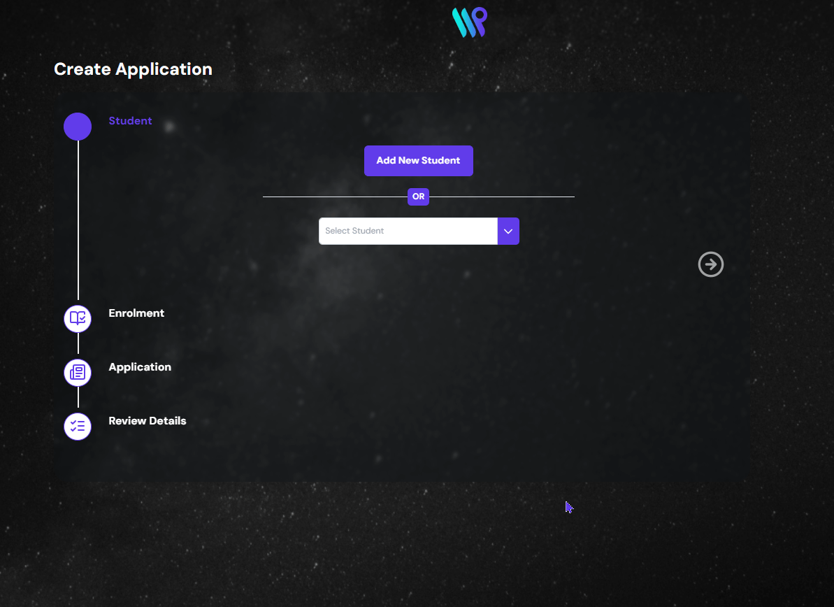 The first step of the process is to create a new student or select existing student.