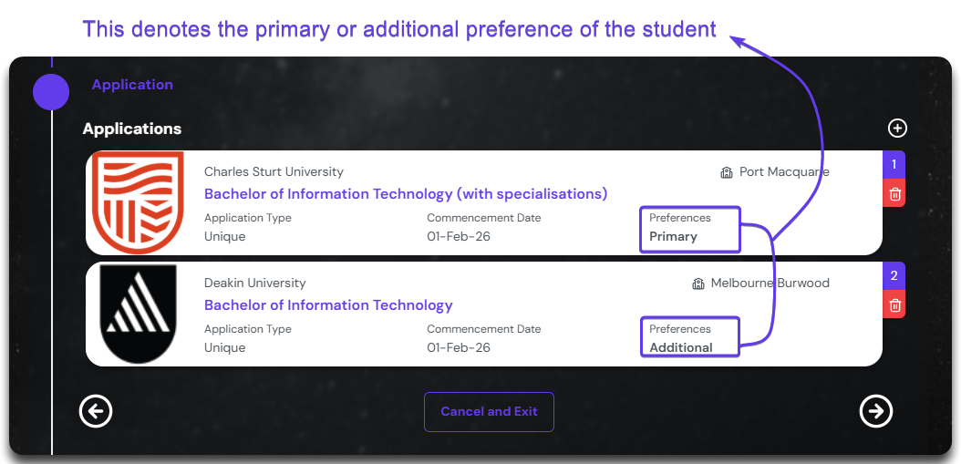 The other things that you can change here is the preference of the application. When applying for multiple courses, we can define what is the first priority or preference of the student. This is denoted by number at the top right corner. The first preference is also mentioned as Primary, and anything after that is Additional Preference.