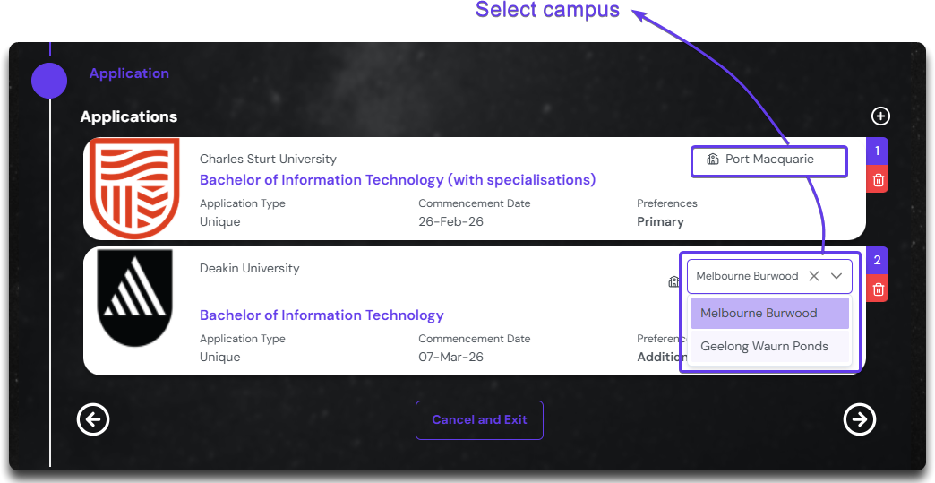 The two course at two different institutions are now carried forward by the system and is displayed as application. First thing to do here would be to select the Campus where the student is interested in studying.