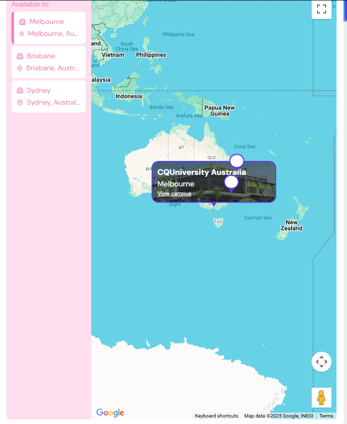 At the bottom you can see campus location in the map view. The left of the map lists the campus location which you can click to zoom in to see the exact location on the map. Use the mouse scroll button or map camera control icon to navigation the map.