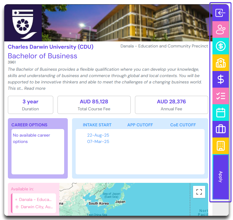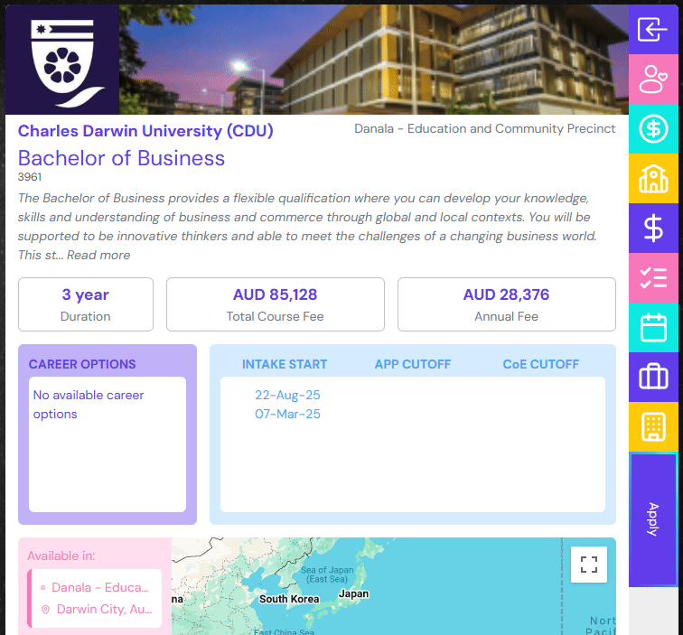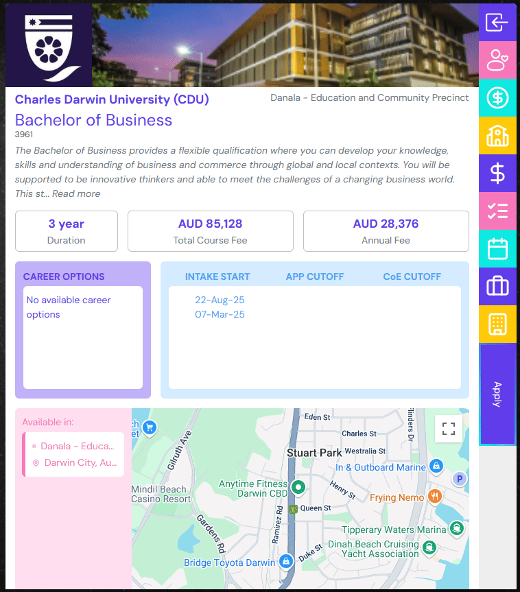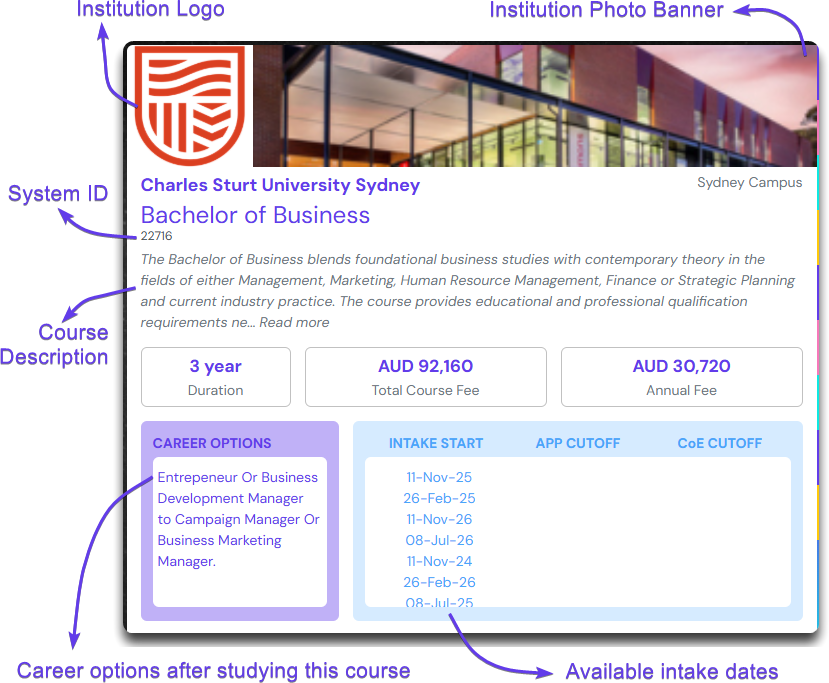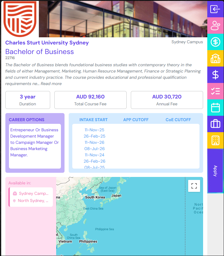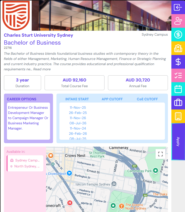 Get most of the information about the course including duration, total and annual cost, career options, intakes and cutoff dates and campus information along with admissions checklist.