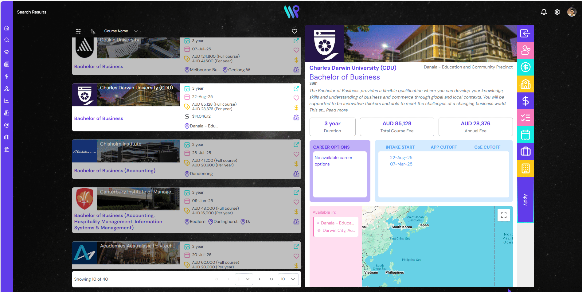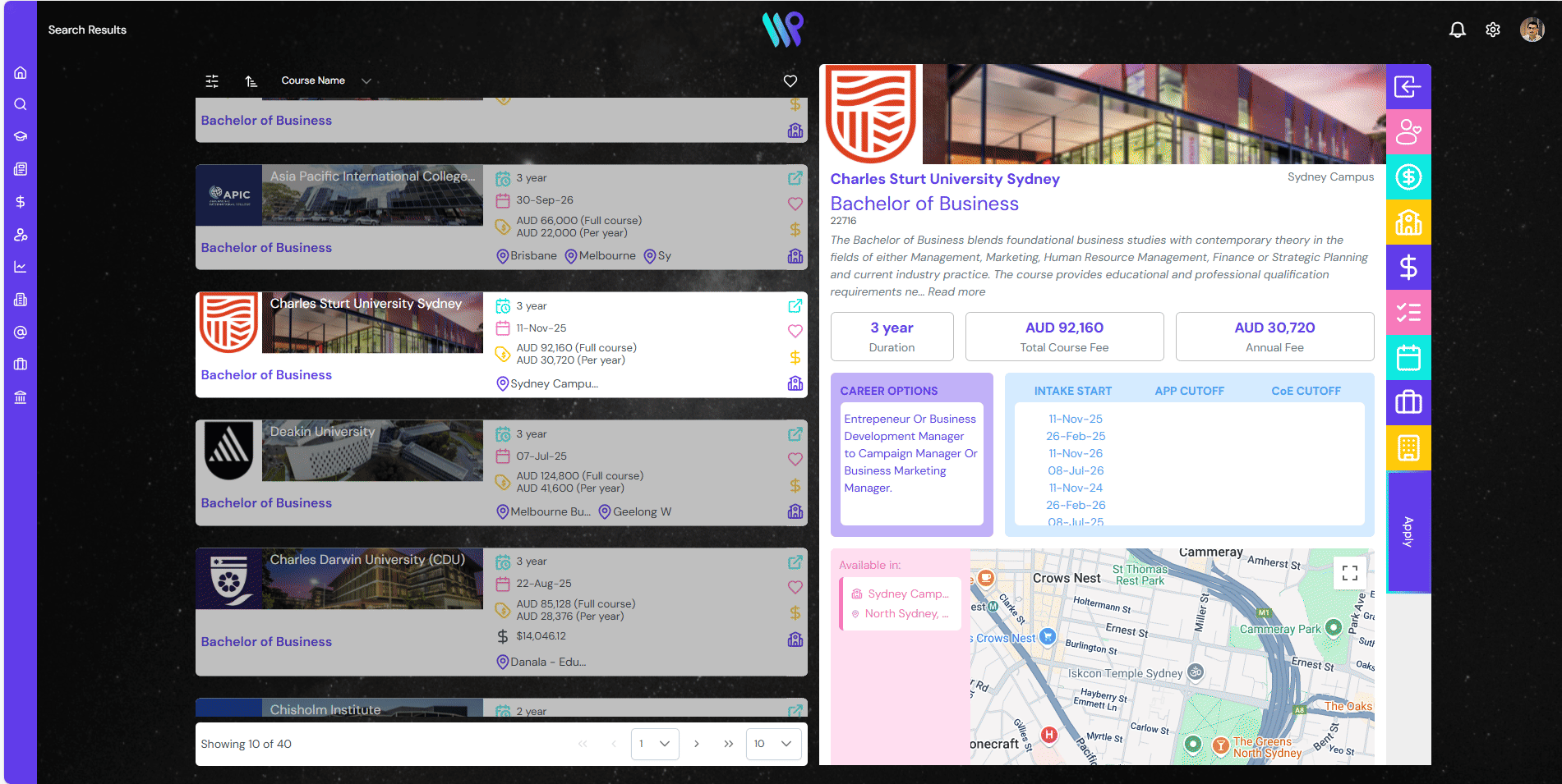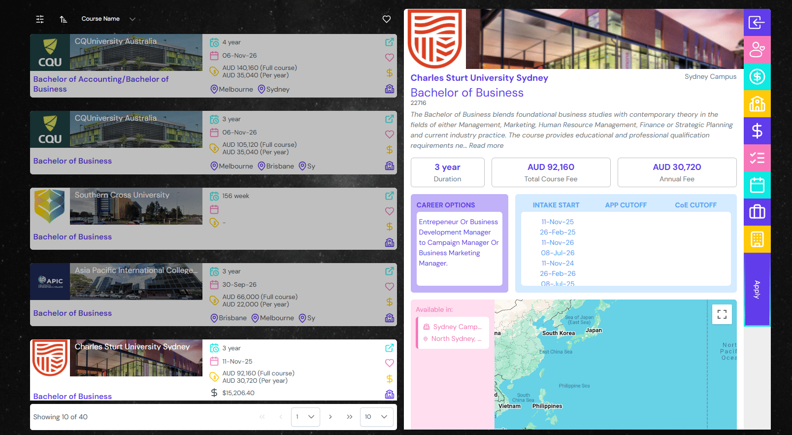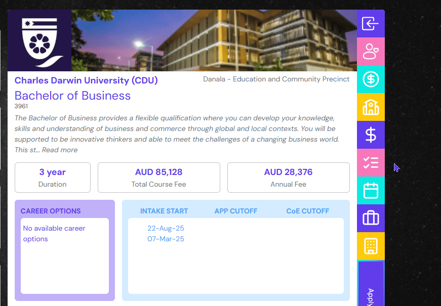 Get most of the information about the course including duration, total and annual cost, career options, intakes and cutoff dates and campus information along with admissions checklist.