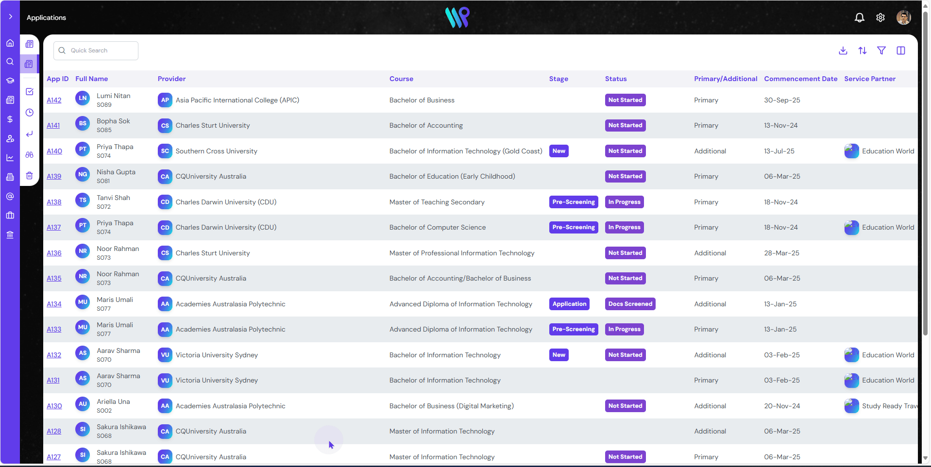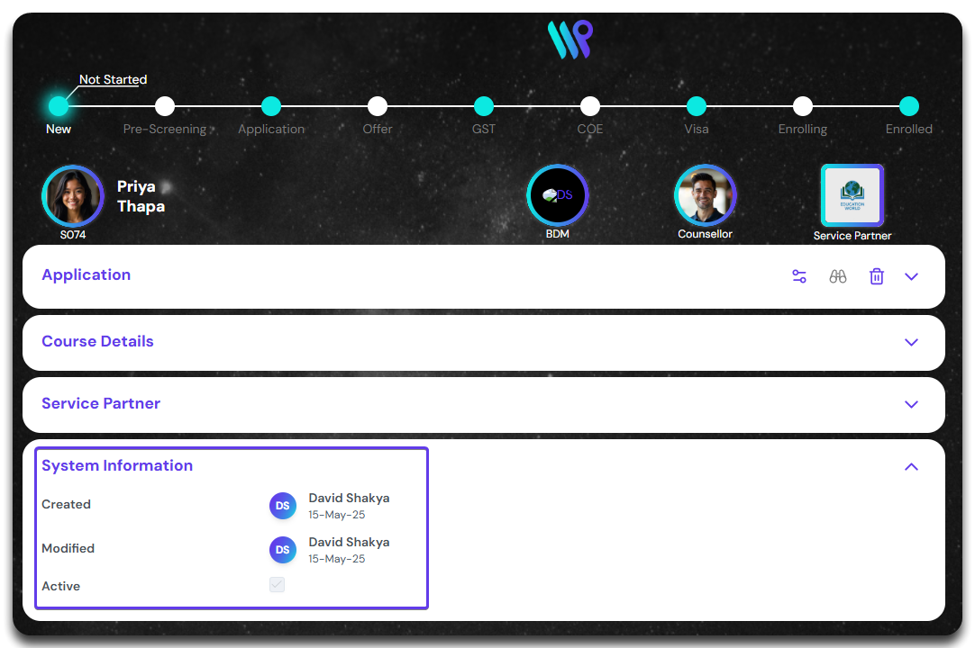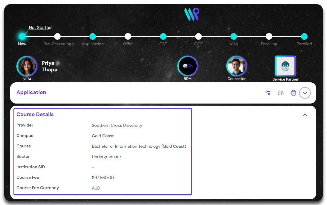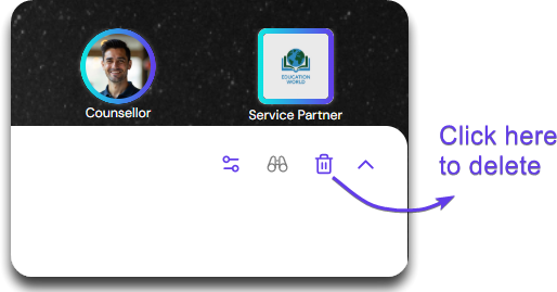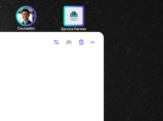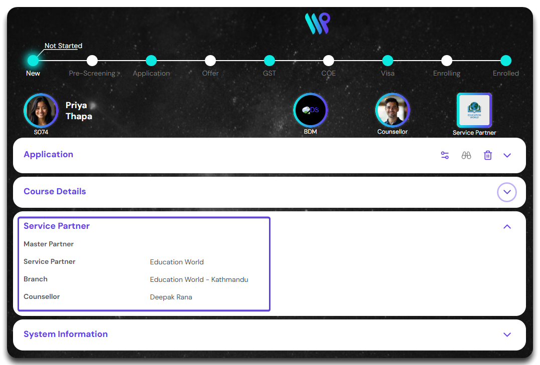 Below the progress bar, photo bar is visible. You can click on the photo of the student to go to student profile. Similarly click on Counsellor’s photo to open the counsellor’s profile and Service Partner logo to open the Service Partner’s company details page.