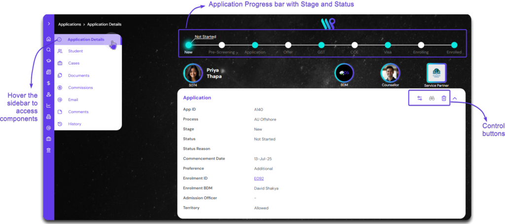 After opening the application record, hover on the side bar to expand and access the components. Click on ‘Application Details’ to get to the view as below.