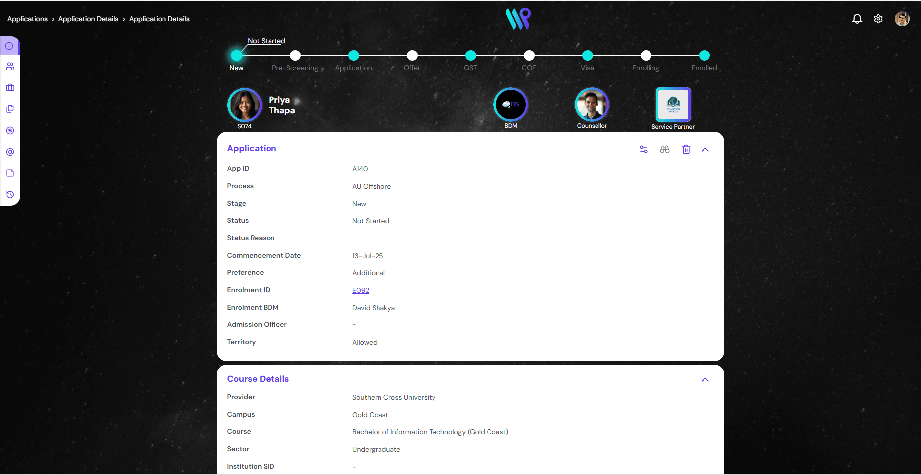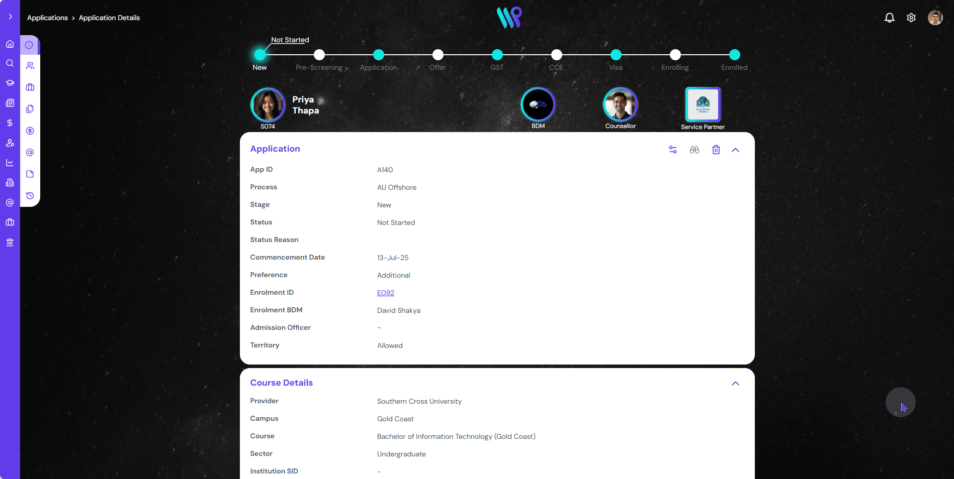 A different section of the application record can be seen in a separate card view. The first part is the application details. You can also go to the Enrolment Record clicking on the Enrolment ID. Click on the Expand / Collapse button as needed.