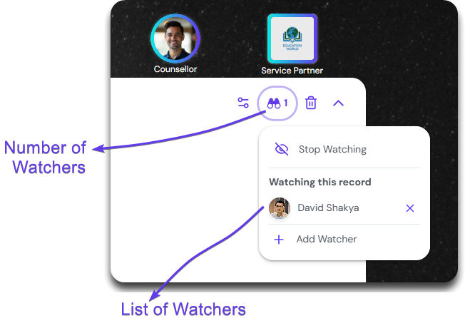 All the watchers will be listed under “Watching this record”. The number of users watching the record is also displayed next to the binocular icon.