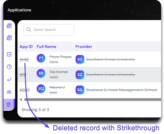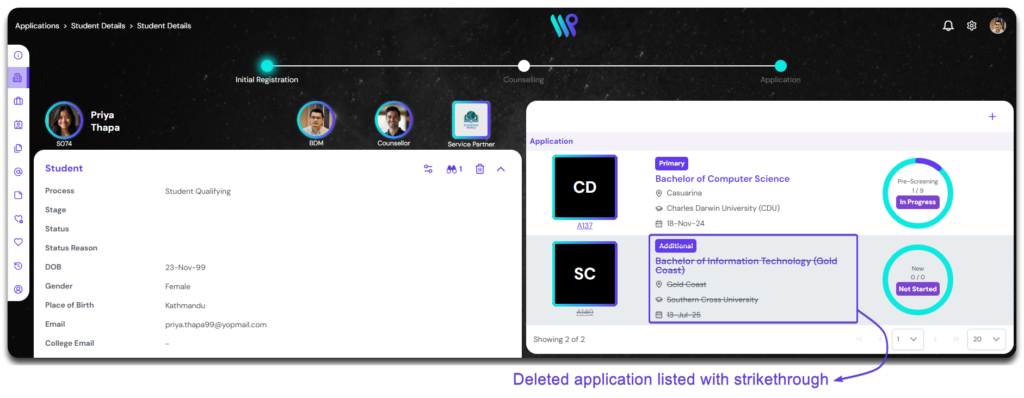 Also, it will be appearing with the strikethrough on the application pane on the student record as well.