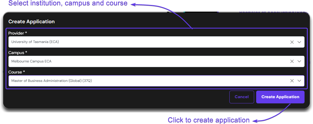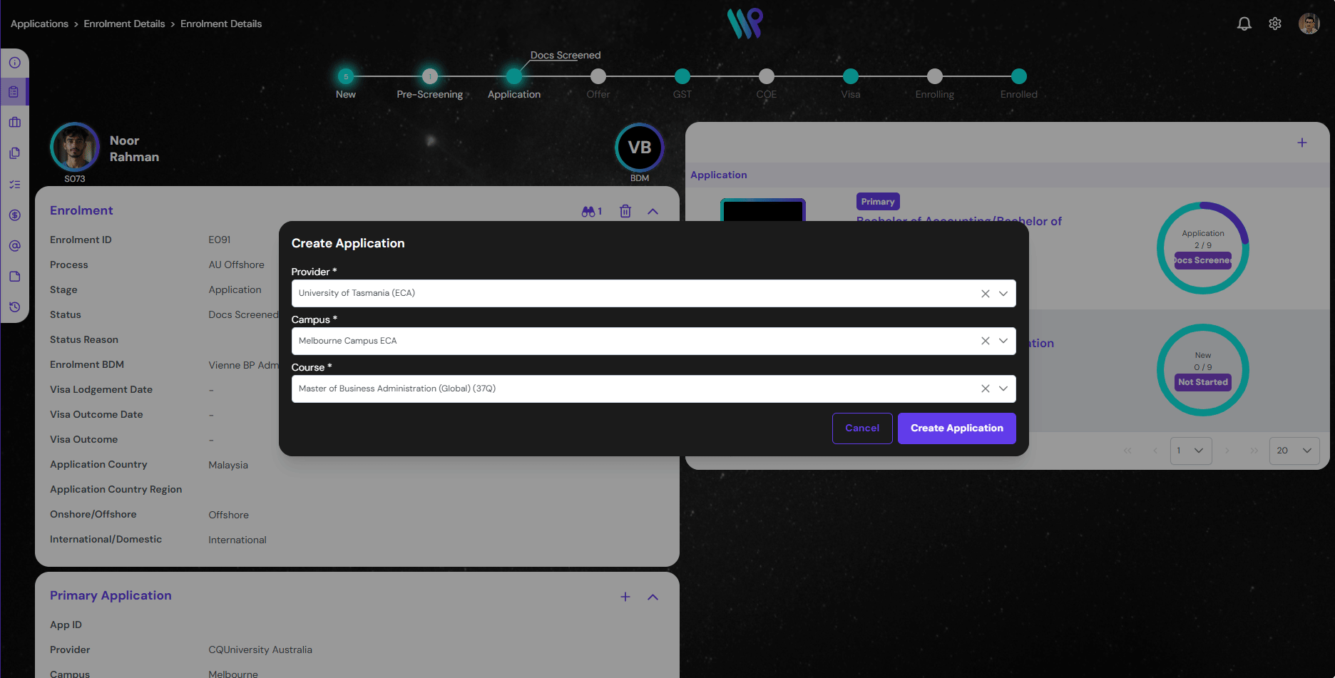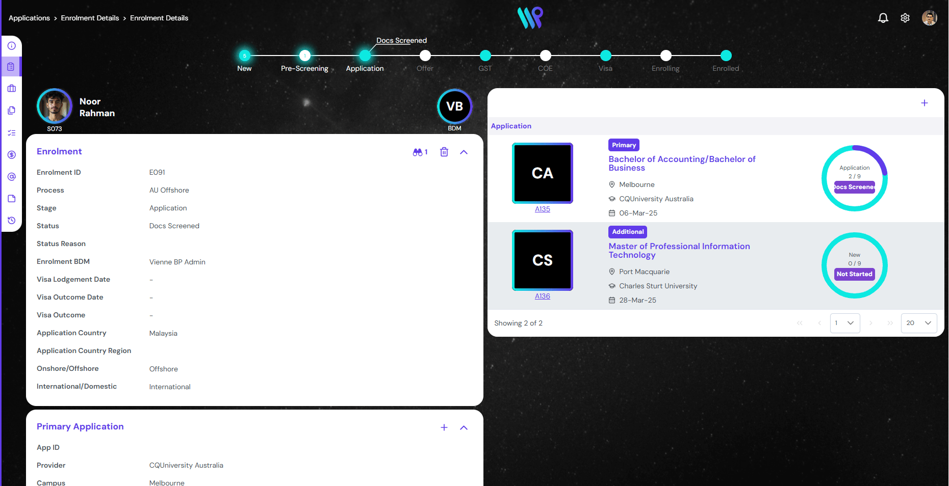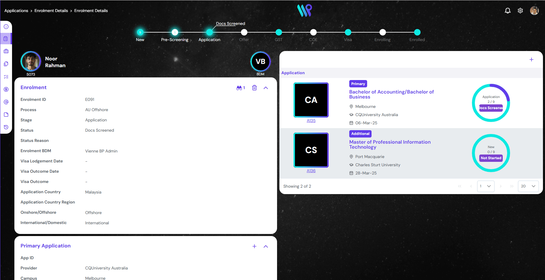 The snippet of the application can be viewed here on the application card. You can see the course, institution and campus details the student has applied to in this enrolment. Also, the current stage and status of the application can be seen on the circle.