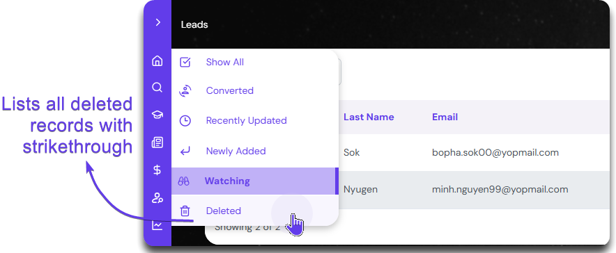 Clicking the Deleted button will list all the deleted student records with a strikethrough.