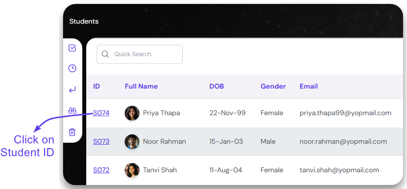 Click on the student ID on the list view to open up the student record.