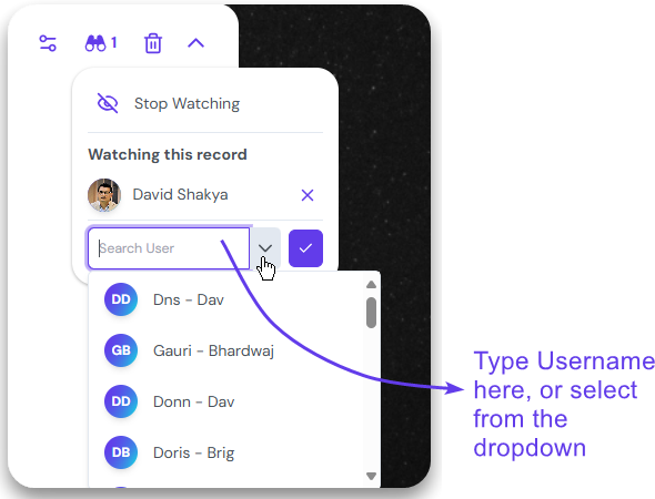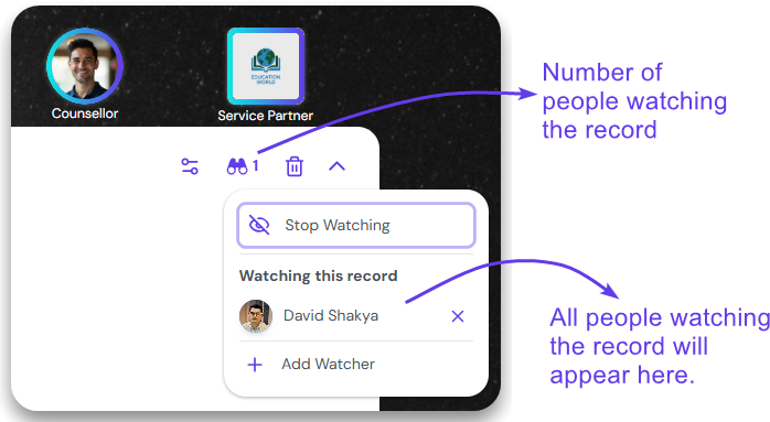 All the watchers will be listed under “Watching this record”. The number of users watching the record is also displayed next to the binocular icon.