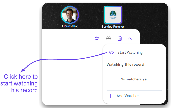Click on the binocular icon from the Control buttons. Click on ‘Start Watching’, to add yourself as the Watcher of this record.