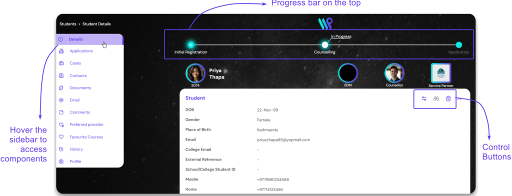 Below the progress bar and the photo bar, you will be able to see the student records details.