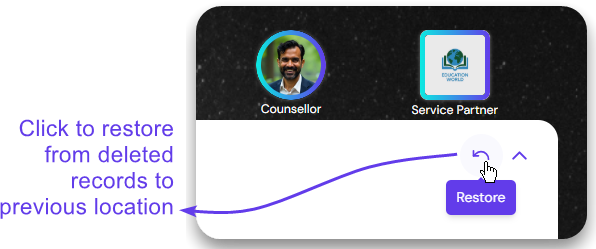 Open the deleted record by clicking on the ID. Click on the Restore button to undo deletion. The record will be moved to previous respective location.