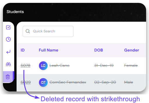 The deleted records can be access from the ‘Deleted’ section of the sider bar. The record will appear with strikethrough denoted it was deleted.
