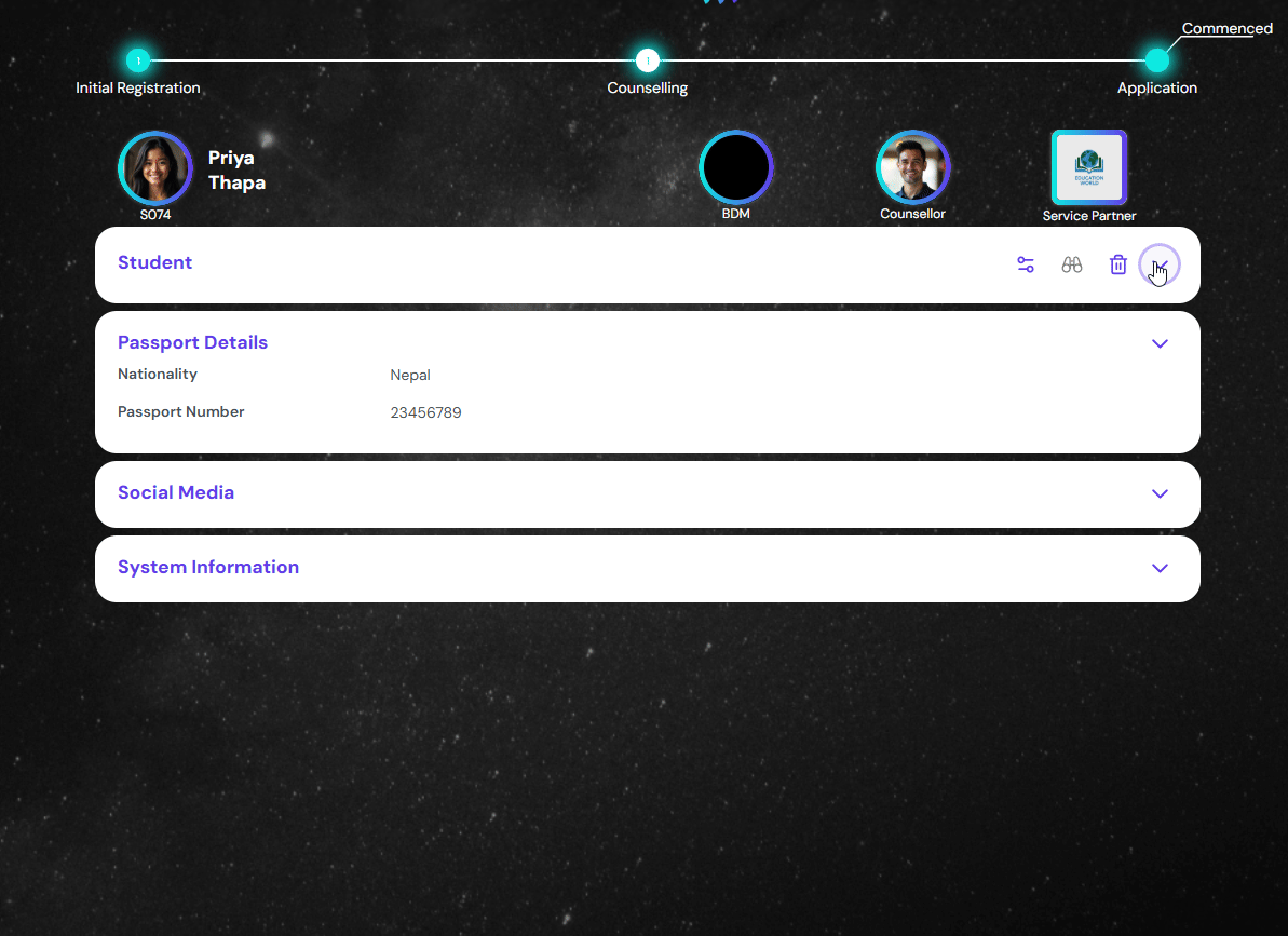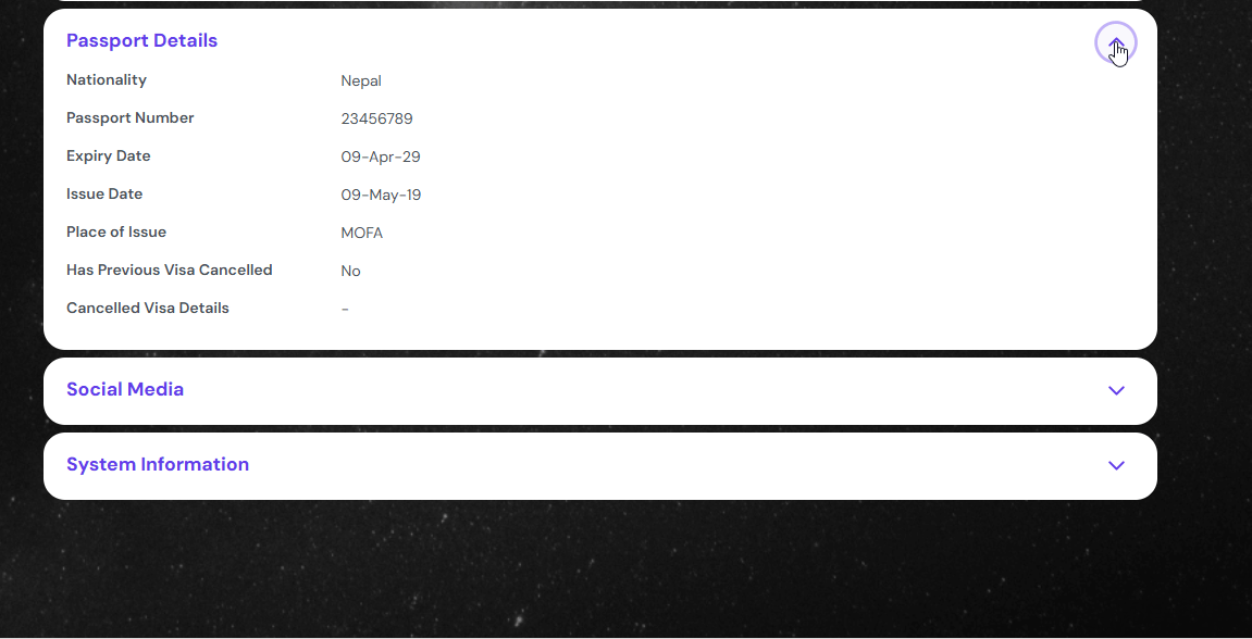 A different section can be seen in a separate card view. You can see the passport details of the student in this. Click on the Expand / Collapse button to see the full details. The bottom part of the card has previous visa related information of the student.