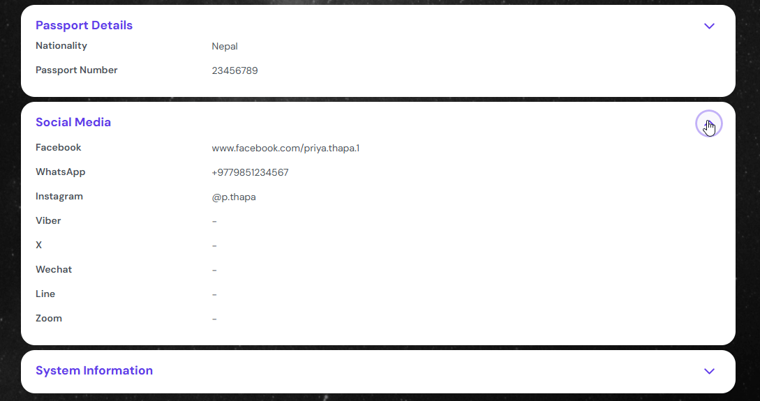 This section covers the social media handles of the student. This section is collapsed by default.
